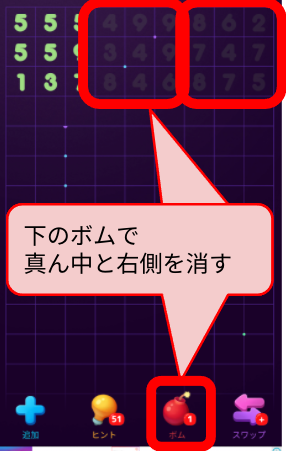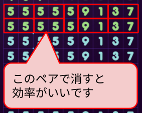 - 足して「10」の組み合わせが高得点になる(1−1で消すより、5−5や1−9の方が高得点)